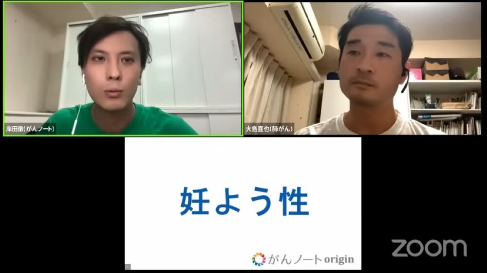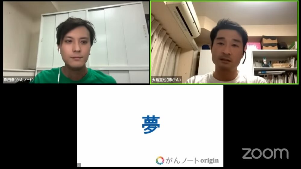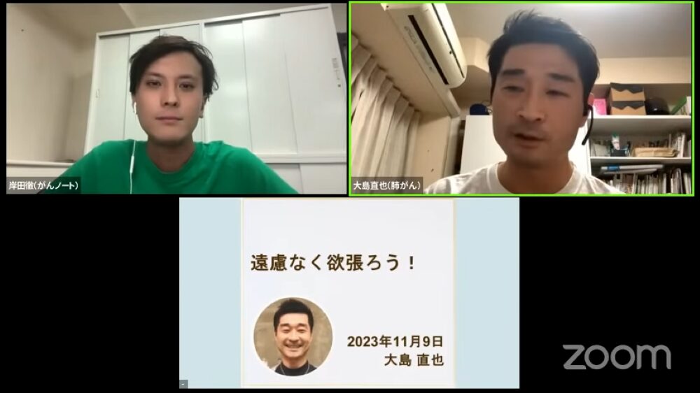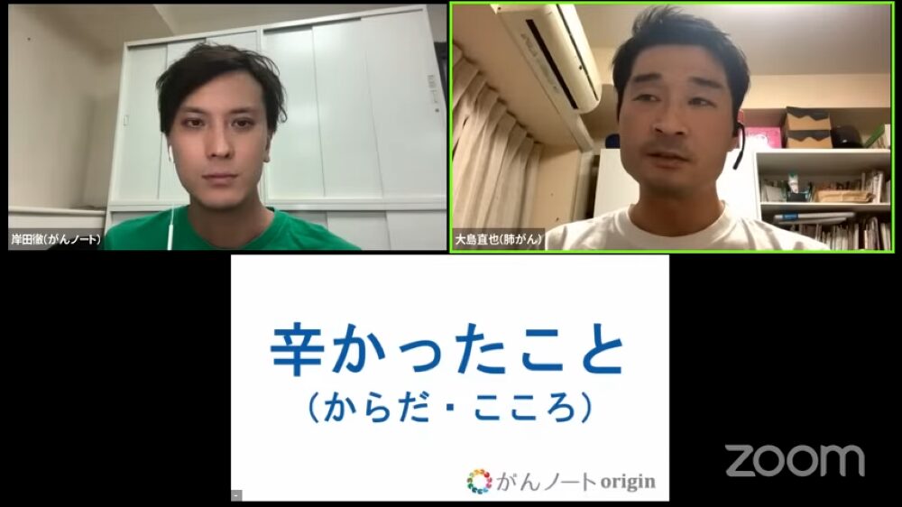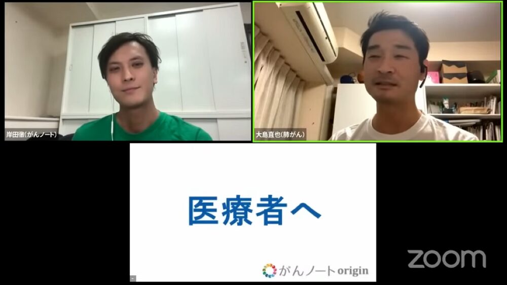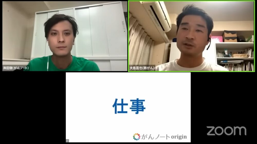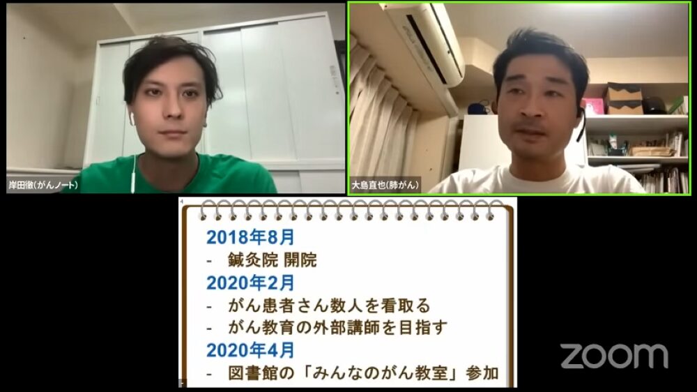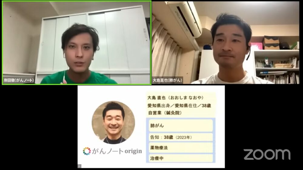 大島 はい。大島と申します。愛知県出身で、現在も愛知県在住です。38歳で、自営業として鍼灸院を営んでいます。肺がんを患い、今年告知を受けました。現在は薬物治療の真っ最中です。