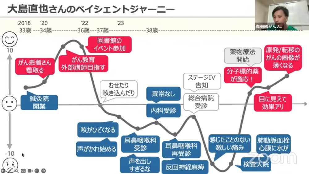 岸田 ありがとうございます。次は「ペーシェントジャーニー」です。大島さんがどのような経過をたどってきたのか、感情の起伏も含めて振り返っていきたいと思います。まず鍼灸院を開