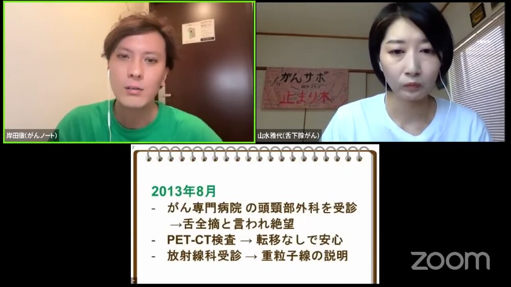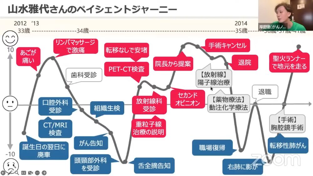 岸田 なので上がっているということです、ありがとうございます。歯科を受診していって、口腔外科を受診していく。その後、そこでCTやMRI検査を受けて、組織生検をやっていった中で、がんの告知を受けていきます。そこからがん専門病院の頭頸部外科を受診して、舌の全摘を告げられる。これが標準治療というか、最善の方法だと説明されます。ただその後、PET検査をして転移なしで安堵して、放射線科で重粒子線治療の説明を受ける。そこからセカンドオピニオンに行き、そのセカンドオピニオン先で院長からの提案を受ける。だから、重粒子医療センターでの提案は院長からだったんですね。