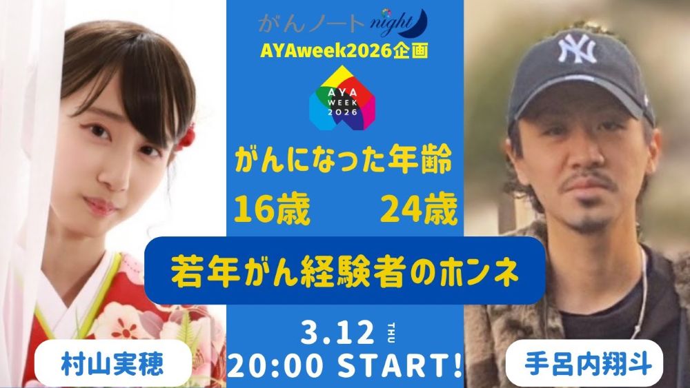 配信終了がんノートnight【若年がん経験者のホンネ】AYA week 2026 企画 日時 2026年3月12日 8:00 pm / オンライン AYA Week特別LIVE 胚細胞腫瘍経験者3人で語る若年がん 今回のライブでは、 胚細胞腫瘍を経験した3人が集まり、若年がんについて語ります。 MCの岸田も胚細胞腫瘍経験者。 そして男性・女性それぞれの立場から経験し […]