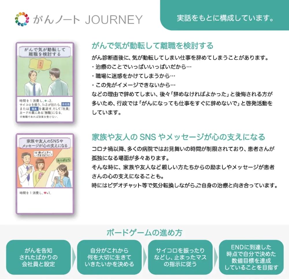 私たちは10年間、「どうすれば、がんを自分のこととして感じてもらえるか」を模索してきました。そしてたどり着いたのが、このボードゲーム「がんノートJOURNEY」という形です。